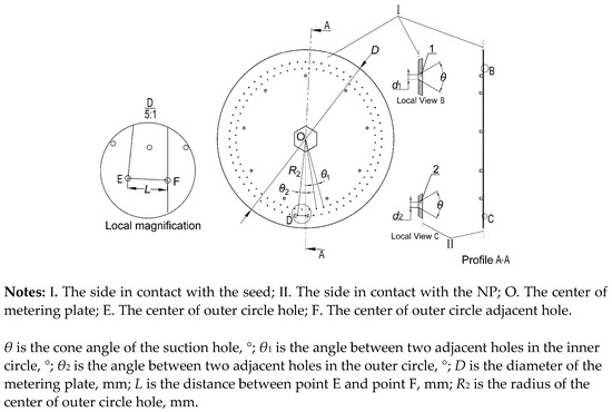 As key parts of the seed metering device, the structure parameters of the metering plate have a significant effect on seed filling performance [13,14]. The integral structure and key dimensions of the metering plate are shown in Figure 2. The position of the outer circle hole is low at the seed-filling zone, and the pressure exerted by the upper seeds on the lower seeds is large, resulting in an increase in the seed-filling resistance of the lower seeds. Moreover, the linear velocity at the center of the outer circle hole is larger than that at the inner circle hole. The seed-filling time is relatively shorter, so the outer circle hole is more difficult to fill under the same conditions. The diameter of the outer circle hole is determined according to the size of the seeds using Equation (3):
