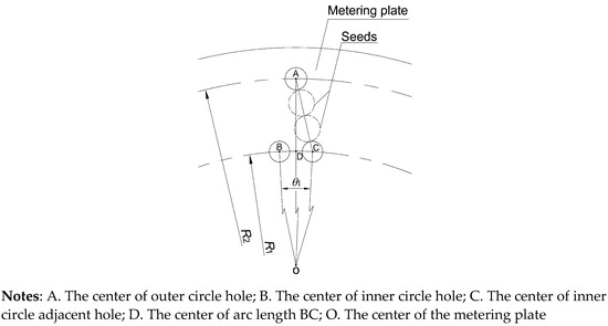 The space between the inner and outer circles holes is an important factor to ensure the seeding quality of a double-row metering device. Furthermore, the space of the holes directly affects the stability of seed movement. The relationship between the inner and outer holes is shown in Figure 3.