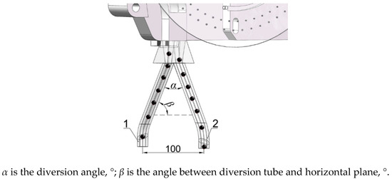The diversion tube guides the seeds placed on the metering plate of double-row holes to form double-rows and the seeds flow and fall smoothly along the surface of the wall. The seeds drop from the outer circle holes through the No. 1 diversion tube, and the inner circle holes through the No. 2 diversion tube. The diversion tube is shown in Figure 4.