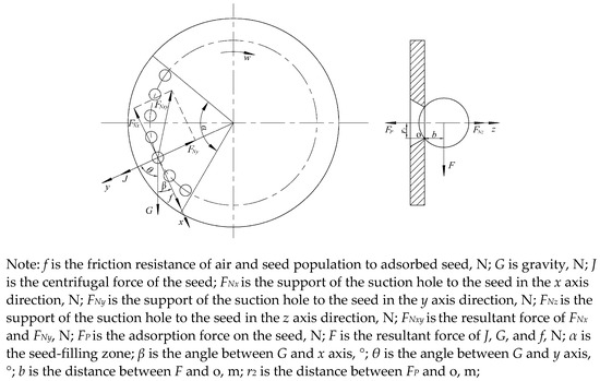 Owing to high average spherical ratio, the seeds of BC can be regarded as a sphere during the force analysis of the seed-filling process. The force analysis is aimed at the outer circle seeds that are difficult to be adsorbed by the suction hole in the seed-filling zone. During the seed-filling process, the force acting on the adsorbed seeds was divided into component forces in three directions (x, y, z), as shown in Figure 5.