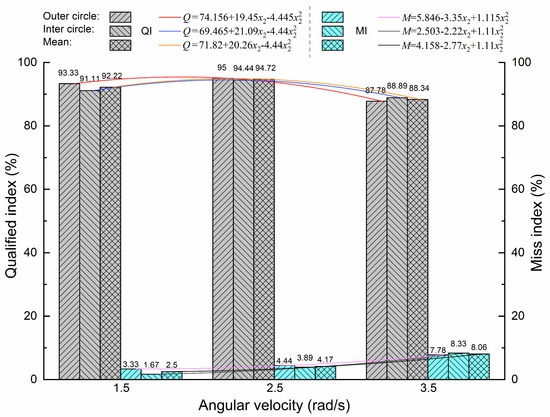 From Figure 8, it can also be seen that the QI of the inner and outer circles was high (Q ≥ 92%) and the MI of the inner and outer circles was low (M ≤ 4%) when the AV was in the range of 1.62–2.28 rad/s.
