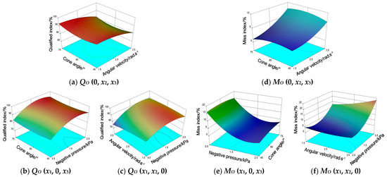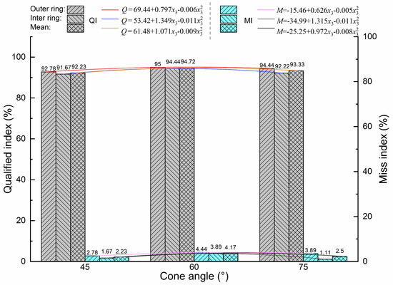 It can be seen from Equations (18)–(21) that the significant factors that affect the QI of the inner and outer circles are NP (x1), AV (x2), the interaction term of NP and AV (x1x2), and the quadratic term of NP (x12). The significant factors affecting the MI of the inner and outer circles are NP (x1), AV (x2), the interaction term of NP and AV (x1x2), the quadratic term of NP (x12), and the quadratic term of AV (x22). In addition to the above, other factors affecting the miss index of the inner circle (MI) include quadratic term of the CA (x32).