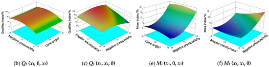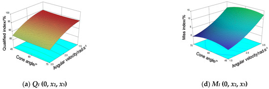 Figure 11a shows that when the NP was 1.5 kPa, under the condition of similar AV, the change in CA had no significant effect on the QI, while the MI first increased and then decreased with the increase in CA. Under the condition of similar CA, QI decreased with the increase in AV, but the trend for MI was the opposite. It can be seen from Figure 11b that when the AV of the metering plate was 2.5 rad/s, under the condition of similar NP, the change in CA had no significant effect on the QI and MI. Under the condition of similar CA, when the NP was in the range of 0.5–1.7 kPa, QI increased with the increase in NP, but the MI decreased sharply with the increase in NP. When NP was greater than 1.7 kPa, QI decreased with the increase in NP. From Figure 11c, it is evident that when CA was 60°, under the condition of similar AV, the QI first increased and then decreased with the increase in NP, while the trend for MO was the opposite. When the NP was low (NP ≤ 1.4 kPa), the effect of AV on the QI and MI was significant. QI decreased with the increase in AV, while the trend for MI was the opposite. When NP was large (NP > 1.4 kPa), the effect of AV on QI and MI was not significant. Overall, it was determined from the figure that QI was high (QI > 92%) and MI was low (MI < 5.5%) when NP was in the range of 1.2–1.6 kPa and AV was in the range of 1.65–2.35 rad/s.