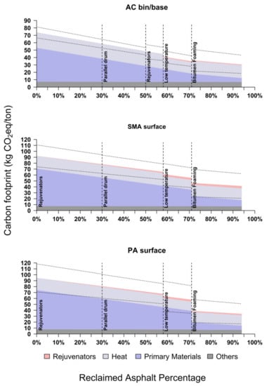 The carbon footprints of asphalt mixtures with increasing reclaimed asphalt pavement (RAP) content were estimated using a life-cycle assessment methodology. Three asphalt mixtures with different applications and technical requirements, namely porous asphalt (PA), stone mastic asphalt (SMA), and asphalt concrete (AC), were included. The technology leaps needed to achieve asphalt mixtures containing up to 93% RAP were modelled. Mixtures containing up to 57% RAP were hot-mix asphalts (175 °C), while mixtures containing more RAP were produced at 135 °C and 105 °C. The energy requirements and their respective carbon footprints were calculated based on the heat capacity of the aggregates, RAP, and other bituminous materials. Furthermore, the effects of changing the country’s electricity mix were also evaluated. A potential carbon footprint reduction of between 55% and 64% was found for one tonne of asphalt containing 93% RAP and produced at 105 °C compared to the 0% RAP mixture produced at 175 °C. Considering the uncertainty of this technology at its early stage of development, the reduction could be as low as 45% or as high as 79%. Changing the electricity mix to one that is likely to be implemented until 2030 in the Netherlands further reduces the footprint by 10%.