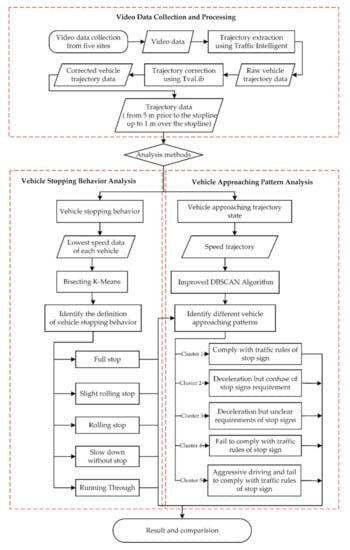 The methodology, as presented in Figure 1, consists of three main steps: (i) video data collection and processing, (ii) vehicle stopping behavior definition, (iii) vehicle approaching pattern analysis.