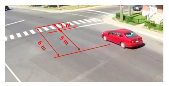 The prevailing rule of the stop-controlled intersections is that all the vehicles must come to a full stop behind the stop line and proceed when it is safe. Moreover, if the stop sign is set on the minor approach of the intersection, vehicles on the minor approach must stop and watch the vehicles on the major road. To study the driver behavior when approaching the intersection with a stop sign, the stop line is first identified for analysis. At stop-controlled intersections, all vehicles must stop behind the stop line so as to avoid a traffic violation. Most vehicles are expected to moderately brake or hard brake when they approach the stop line to ensure the vehicle can stop at the stop line [41]. However, some vehicles may not fully stop at the stop line because either their approaching speed is too high or they do not intend to stop at all. To study the full spectrum of these driver behaviors using video data, an analysis zone is defined for each location based on the consideration of the limited coverage of the video camera and the extent of the driver’s expected response, as well as vehicle length [42]. The analysis zone includes the segment 5 meters before the stop line to 1 meter after the stop line, as shown in Figure 2.