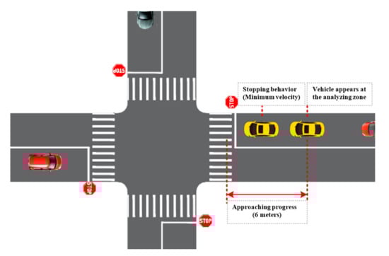 Despite the lack of advanced methods to automatically detect the microscopic behavior of the drivers at stop-controlled intersections, researchers have conducted many manual observations of different behavior types and statistical analyses of the drivers in front of stop signs [14,17,18,19,20]. Shaaban et al. [20] investigated driver compliance behavior in front of stop sign intersections in Qatar using field observations. McKelvie et al. [19] observed the behavior of 600 automobile male or female drivers when they approached stop signs during the day and night, and analyzed the full stop, slow stop, no slow or stop behavior of drivers by percentage. Beanland et al. [17] found that 59% drivers stopped completely at rail level crossings, 27% of drivers made a rolling stop, and 14% of drivers made no slow or stop behavior. This study observed the driving behavior of twenty-two volunteers. DeVeauuse et al. [18] investigated the rate of driver compliance behavior with stop signs in college campuses using observers. Statistical analyses to define the types of driver behavior have been proposed [16,17]. For instance, Beanland et al. [17] defined a rolling stop as a speed below 10 km/h and above 0 km/h. However, the method used to study the microscopic behavior in front of the stop sign remains subjective.