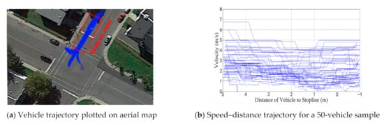 As the trajectory extracted from the video is in the format of time-stamped latitude and longitude coordinates, it is necessary to transform the latitude–longitude trajectory into speed–distance trajectory for implementing the proposed approach. As presented below, Figure 6a presents sample trajectory data plotted on the aerial photo for a site involved in this study, and Figure 6b presents the converted speed–distance trajectories for a sample of 50 vehicles.