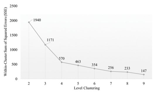 To evaluate the appropriate number of driver-stopping behavior clusters, according to the potential groups shown in Table 1, bisecting K-means clustering analysis was repeated for two groups, three groups, four groups, and five groups. The clusters were evaluated through the within-cluster sum of squared errors of the cluster, and this was the objective of this study. The smaller the value of the within-cluster sum of squared errors (SSE), the better the clustering result. The within-cluster sum of squared errors is computed as follows Equation (1):