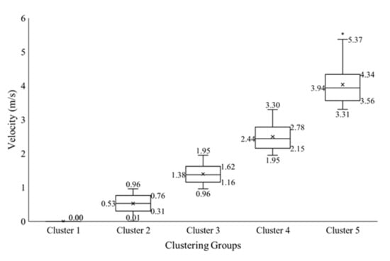 Figure 10a provides the clustering results of different vehicle approaching patterns using the improved DBSCAN algorithm based on the speed–distance trajectory in the analysis zone. The statistical summary of the five patterns of vehicle approaching process is provided in Table 4, including the number of observations in each type of cluster, the proportion of each type, the mean of the 15th percentile speed, the minimum value of all the 15th percentile speeds, the maximum value of all the 15th percentile speeds, the mean of the 85th percentile speed, the minimum value of all the 85th percentile speeds, and the maximum value of all the 85th percentile speeds.