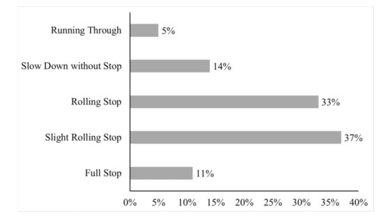 Stop signs are one of the most commonly applied traffic control devices around the world, especially in North American and European countries. At stop-controlled intersections, vehicles are required to come to a full stop in front of the stop bar, regardless of whether conflicts are presented or not [1]. However, evidence suggests that there is a large variation in how drivers behave at the stop-controlled intersections, and that many drivers tend to just slow down and slide, instead of come to a full stop [2,3]. For example, a field study conducted in the US showed that roughly 45% of the 25,660 vehicles observed did not fully stop at stop signs and 7% of the vehicles did not slow down at all when passing the stop sign [4].