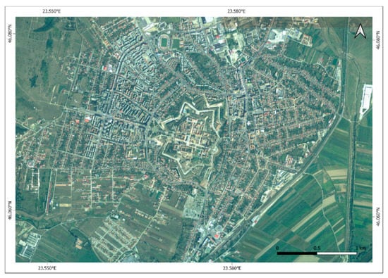 Orthophoto image of Alba Iulia City (© image source: Romanian National Agency for Cadaster and Real Estate Advertising (ANCPI) geoportal—https://geoportal.ancpi.ro/). The seven-point star-shaped medieval citadel represents a unique Transylvanian landmark.
