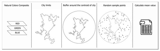 For the city limit corresponding to the year 2018, a centroid was created and used as the base for generating a buffer of 7.5 km that enclosed the city (Figure 5). The dimension of the buffer was chosen to be 7.5 km in order for the resulting vector to be larger than the extremities of the city. After the buffer creation, a total of 100 random sample points were created inside the clipped buffer, but outside the city limits. The resulting points were used to calculate the mean temperature outside the city limits for each of the 31 Landsat satellite images exploited in this study. In order to calculate the UHI, the values previously calculated were subtracted from the land surface temperature product.