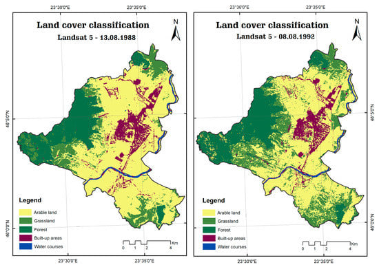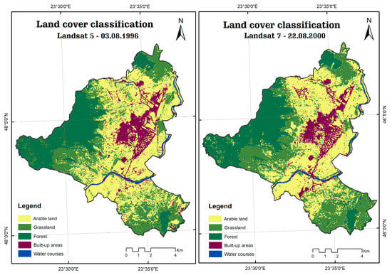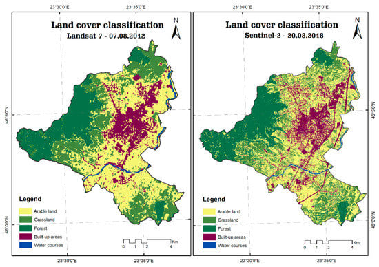 Supervised classification of the multitemporal images was performed for the identification of the land cover changes, as this approach is suitable for the monitoring and management of the built-up areas []. The processing of the Landsat and Sentinel-2 images was performed using the ArcGIS Software. Considering the human activities and the development of functional areas, five main classes were defined and analyzed, namely: Arable land, Grassland, Forest, Built-up area, and Water course. The land cover maps were obtained through the supervised classification of the time series composed of the 8 satellite images, using the maximum likelihood method. The main steps of the supervised classification include the subset of the area of interest, the definition of the training samples, and the generation of the classification results.