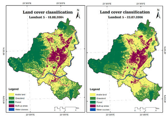 Next, the land use/land cover changes were analyzed (also including the supplementary land cover datasets), with a special emphasis on the evolution of the urban extension, as the process might affect the cultural heritage site and cause significant changes in temperature values as well [].