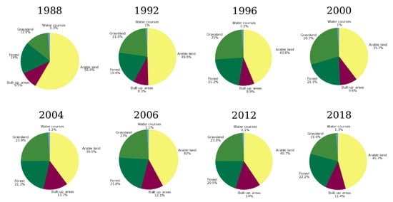 Percentage distribution of the land cover classes (investigated time frame: 1988–2018).