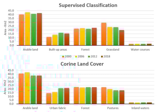 Evolution of the land cover classes according to the supervised classification and CORINE Land Cover (in 2000, 2006, 2012, and 2018).