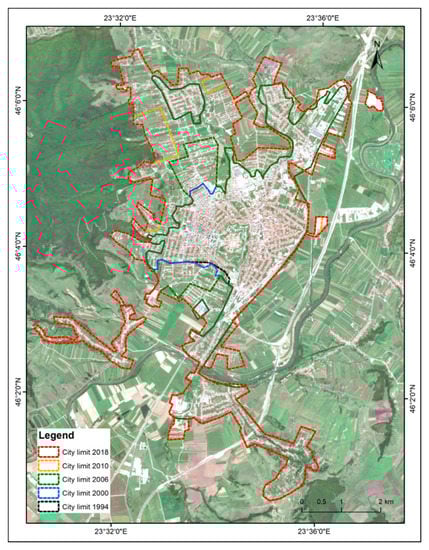 Evolution of Alba Iulia city limits over the investigated time frame (1994–2018); background satellite image: Sentinel-2 (© European Space Agency).