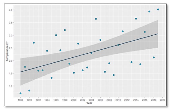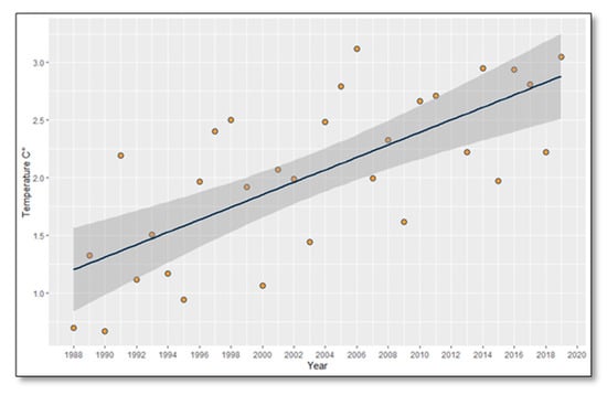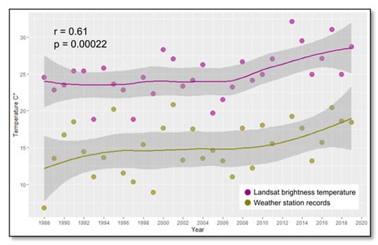 UHI can be determined using the thermal infrared band of optical remote sensing satellites []. Compared to the in-situ measurements, in which case a limited number of areas can be monitored, satellite remote sensing gives the possibility of obtaining precise measurements over large areas with minimum costs. The availability of the Landsat archive enables the long-term identification of the temperature trend.