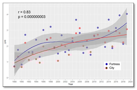 The two resulting data series representing the evolution of temperatures in the study area were statistically analyzed using R programming language with the help of RStudio, an easy-to-use, open-source, integrated development environment (IDE) software. For this statistical validation, the Pearson linear correlation coefficient was calculated in order to investigate whether there was a correlation between the rise of temperatures in the city and in the fortress. By adding the two Excel files with the temperatures for the city and for the fortress, a graph representing the two data series was plotted. Simultaneously, the “r” coefficient was calculated. The results showed a high positive correlation [] between the two data series, with a value of 0.83 for the Pearson “r” coefficient (Figure 17).