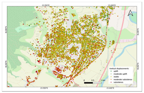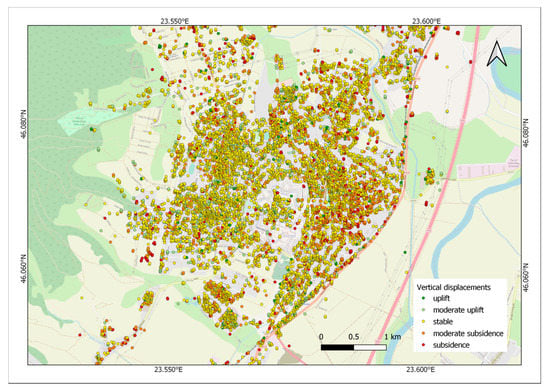 The last step is represented by the georeferencing process. The output is a file containing the PSs symbolized as points. In this step, a coherence threshold of 0.65 was applied, considering that coherence ranges from 0 to 1, starting from low data quality to high quality []. The LOS and the vertical displacements were generated and projected into the WGS84 cartographic system. Due to the looking angle, the satellite observes and measures the vertical displacements more accurately than the horizontal ones []. If the PSs are moving towards the satellite, the displacement values are positive, and if the movement is away from the satellite the values are negative.