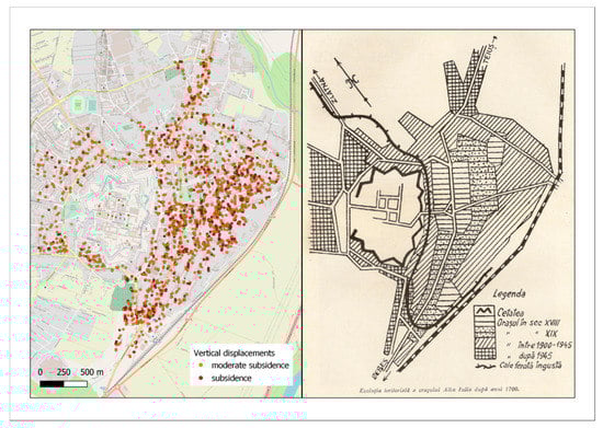 From the urban planning perspective, Alba Iulia had two distinct areas, namely, a fortified area that included the bastion fortress of the Vauban type and an open urban area that was developed in Roman times within two different locations that evolved into two attested settlements, specifically, Colonia Aurelia Apulensis and Colonia Nova Apulensis. The open urban area was developed mainly around the fortress, on the western, southern, and northern sides, almost entirely at approximately 20 m above the floodplain of the Mureș River []. Starting in the 18th century, the draining works performed on the eastern side of the fortress enabled the reconfiguration of the open urban area. Consequently, during the 18th and 19th centuries, the open urban area was relocated mainly to the eastern, southeastern, and northern sides of the fortress []. Except for the buildings located in the protected area corresponding to the fortress, the rest of the Alba Iulia buildings were built starting in the middle of the 18th century and predominantly between the end of the 19th century and the beginning of the 20th century []. Nowadays, the eastern and southern parts of the city are affected by the high groundwater levels that are caused by the initial marshland area that was drained [].