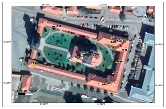 The spatial distribution of the UHI over Alba Iulia city and Alba Iulia Fortress during the study period is illustrated in Figure 14. The results were obtained by calculating the average value of every UHI product generated for the study period. Variations could be observed within the limits of the city, with peaks in areas corresponding to industrial and commercial districts with values as much as 8 °C higher than the surrounding areas. In the case of Alba Iulia Fortress, the fortification walls acted as a barrier, especially due to the covering vegetation layer. The temperatures measured in the area of the fortification walls averaged 1 °C lower than the surrounding areas. Two hotspots caused by the presence of large commercial and residential areas with tall apartment blocks were present to the north of the fortress. The data also shows that, in terms of habitation, the areas less affected by thermal discomfort were the outskirts, with the exception of the northeastern area, which is highly industrialized.