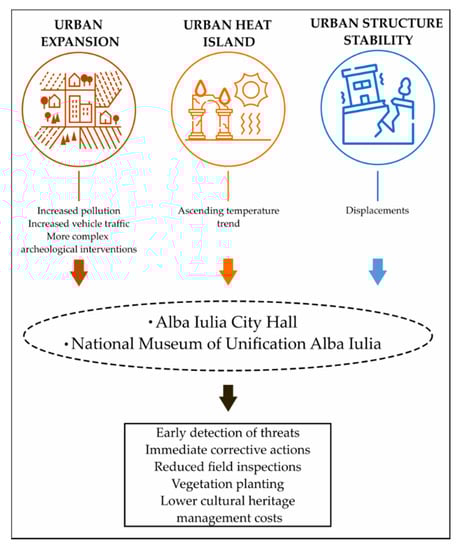 The environmental changes in the Alba Iulia territorial administrative unit were directly related to human activities. The risk represented by human pressure can be monitored and managed for safeguarding the cultural heritage area. Remote sensing data are indispensable in this dynamic process of urbanization because an early update of information enables the continuous and comprehensive monitoring and control of urban expansion [].