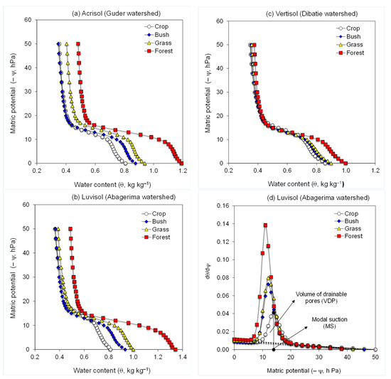 Figure 1. Water retention curves of the soils form (a) Guder (Acrisol), (b) Abagerima (Luvisol), and (c) Dibatie (Vertisol) watersheds used under crop, grass, bush, and forest land, and (d) the specific water capacity curves of soils from Abagerima (Luvisol). The dashed baseline in the specific water capacity curve represents the soil shrinkage line.