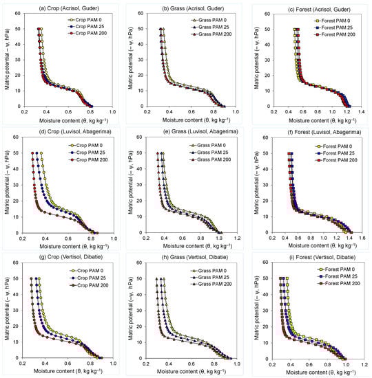 Figure 2. Water retention curves of untreated (PAM 0) and polyacrylamide (PAM) treated (25 and 200 mg L−1) soils used under crop, grass, and forest land for (ac) Guder (Acrisol), (df) Abagerima (Luvisol), and (g–i) Dibatie (Vertisol) watersheds.