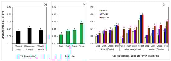 Figure 3. Structural index (SI) of the soils as affected by (a) soil type (watershed), (b) land use, and (c) polyacrylamide (PAM) treatments (0—untreated, 25 and 200 mg L−1). Columns labeled with the same letter are not significantly different at p < 0.05 level: (a), within the soil (watershed); (b), within land use; and (c), within each soil (watershed).