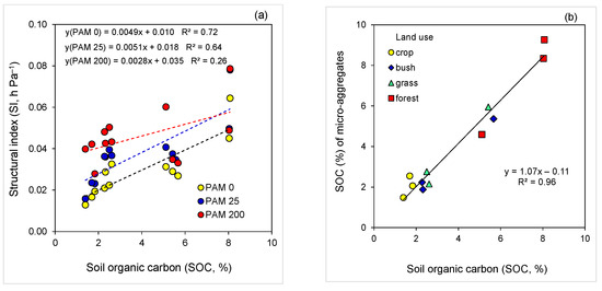 Figure 4. Relations (p < 0.001) between (a) soil structural index (SI) and soil organic carbon (SOC) for untreated (PAM 0) and polyacrylamide (PAM)-treated soils (25, 200 mg L−1), and (b) SOC of micro-aggregates (<0.25 mm) and bulk soil (<2 mm).