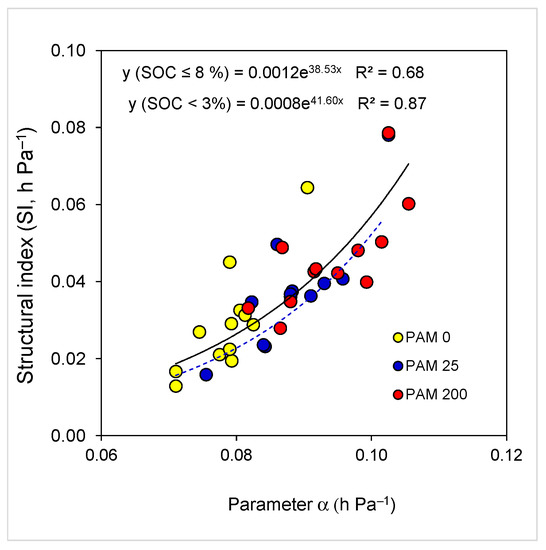 Figure 5. Relations (p < 0.001) between soil water retention model parameter α and soil structural index (SI) for all samples (SOC ≤ 8.1%, solid line) and samples with SOC ≤ 3% (dash line). Soil samples include untreated (PAM 0) and polyacrylamide (PAM)-treated ones (25, 200 mg L−1).