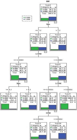 Figure 1 shows the decision tree model established by using the CRT growth method. The target variables are , which contain Ppre, disability categories, SCPM (PM: change in Pre.-to-Mid.), Spre, LCpre, Dpre, SCpre, Lpre, Rpre, SPM, LCPM, DPM, PPM, RPM, LPM, age, and sex. The minimum number of observations in the parent node was 10, the minimum number of observations in the child node was five, the tree depth was four, the number of nodes was 11, the number of endpoints was six, and the significance level was 0.05. In this study, the risk value of the obtained pattern was 0.284, the standard error was 0.050, the sensitivity was 98.0%, and the accuracy was 84.0%, where = 1 (the prior probability was 0.617). The importance of the variables is sequenced as LCPM (0.094; regularization 100.0%), Ppre (0.086; regularization 91.8%), disability categories (0.061; formalization 65.0%), DPM (0.060; regularization 63.5%), Rpre (0.059; normalization 62.5%), SCpre (0.052; normalization 55.0%), LCpre (0.043; normalization 46.1%), SCPM (0.038; normalization 40.4%), and RPM (0.035; normalization 37.5%).