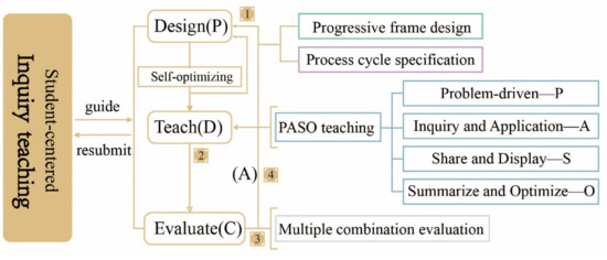 The whole process of RES courses should focus on cultivating students’ attitudes and technologies for the innovative use of RES. Through the integration of innovative, practical, technological, and exploratory courses, students are allowed to exercise their skills in autonomous inquiry and change their attitude in problem-solving [43]. According to the current problems mentioned in the literature review, this work first divided the RES curriculum model into three sections: design, teaching, and evaluation, it then worked out corresponding reference templates for each section to solve the current problems. Finally, all three sections were systematically integrated into a “student-centered inquiry” model for renewable energy curriculum.