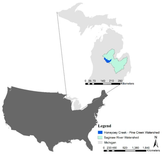 The Honeyoey Creek-Pine Creek watershed (Hydrologic Unit Code 0408020202) is located in the Saginaw River watershed in Michigan, U.S. (Figure 1). The Saginaw River watershed is identified as an Area of Concern by the U.S. Environmental Protection Agency (EPA) []. Nonpoint pollution control is one of the main priorities for action, due to the high level of contaminated sediments detected and degraded fisheries observed in the watershed. Currently, agriculture is the dominant land use within the study area, taking up approximately 52% of the 1100 km2 land area followed by forests (~23%), wetlands (~17%), pasturelands (~5%), and urban (~3%). The domination of agricultural land within the region has a profound impact on stream health, economy, and the surrounding environment.