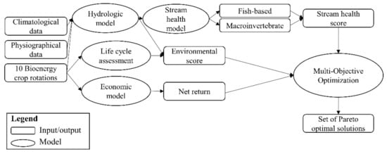 Stream health, life cycle analysis, and economic feasibility must be taken into account to provide policymakers and stakeholders with an environmentally feasible solution for agricultural land use. Therefore, in this study, agricultural land use for bioenergy feedstocks is optimized considering macroinvertebrate- and fish-based stream health indicators, environmental emissions (total nitrogen, total phosphorus, sediments, and sequestrated carbon), and net economic return. Studies have been conducted on the potential for bioenergy feedstock cultivation [,,], but they do not consider all the aforementioned aspects simultaneously. This work aims to take all three key dimensions (i.e., stream health, life cycle analysis, and economic feasibility) into account to optimize for the most sustainable bioenergy cultivation solution in the Honeyoey Creek-Pine Creek watershed in Michigan, U.S. The objectives of this study are to design a novel framework which incorporates the linkages and feedbacks among land use change due to biofuels feedstock production, stream health, environmental benefits, economic return, and optimization techniques. Multi-objective optimization within the framework aims to maximize the benefits of biofuel feedstock production, while minimize potential negative environmental consequences to generate quantitative support for consensus decision-making models. The three objectives of this study were to (1) characterize the mechanism(s) by which atmospheric, terrestrial, and in-stream variables affect aquatic ecological integrities (fish and macroinvertebrate communities) and water quality; (2) establish a framework that quantifies the overall environmental impacts of land use change; and (3) develop a multi-objective optimization tool for the selection and placement of bioenergy crops.
