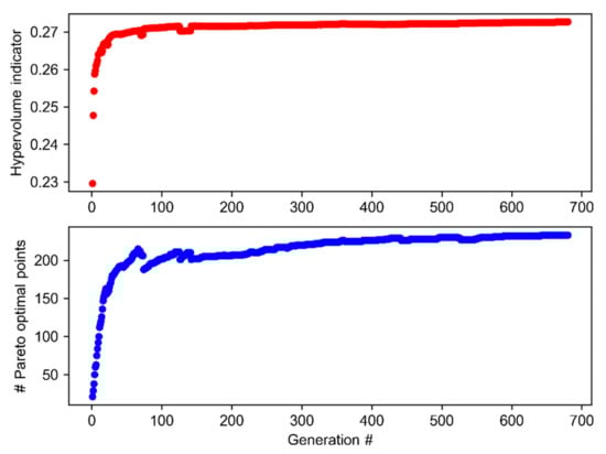 The convergence to a near-optimal Pareto front was analyzed using the Hypervolume indicator and the number of Pareto points at the end of each generation (see Figure 3). Hypervolume measures the collective volume of dominated region by the obtained solutions in the objective space. A set of Pareto solutions is considered better, if the Hypervolume is higher. The Hypervolume indicator was used to analyze how well the method performed at finding Pareto-optimal solutions at the end of each generation []. Eventual convergence of the Hypervolume indicator and number of Pareto points with generations indicate that the Pareto front has stabilized well at the end of the optimization run. The goal for the optimization was to attain convergence in the Hypervolume indicator while generating the maximum number of Pareto points possible from the given parameters. In order to obtain both the Hypervolume and the number of Pareto points for each generation, the following procedure was performed: (i) at the end of each generation, a Pareto front was obtained from the parent population of the current generation; (ii) a new set of solutions was created containing both the Pareto front from the previous step and the Pareto front from the previous generation; (iii) a new Pareto front was determined from the set of solutions of the previous step; (iv) from the new Pareto front, the closest solutions to 500 reference directions were selected; (v) the hypervolume indicator and the number of Pareto points was computed using the filtered set of solutions from the previous step. The filtered Pareto front for the final generation was employed for the subsequent decision-making analyses.