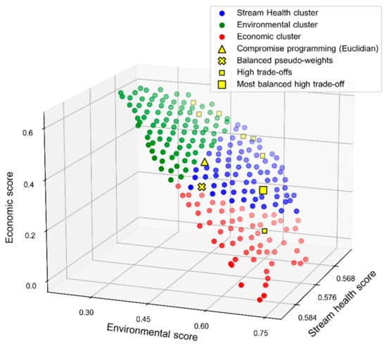 Clustered optimal Pareto front based on normalized economic, environmental, and stream health scores and most-preferred solutions.