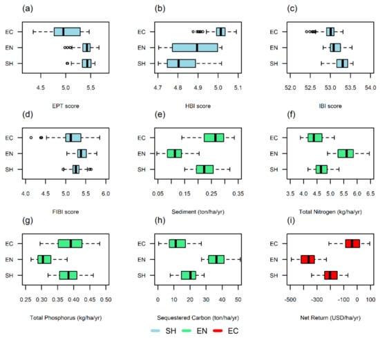 Both the median and interquartile range of the SH cluster for the four indicators were very similar to the mean and interquartile range of the EN cluster. These similarities can also be observed in the higher density of solutions in the EN and SH clusters within Figure 4 and may be explained by the lower sediment and nutrient loads to which the taxa of macroinvertebrates are highly sensitive (see Figure 5a,b) [,]. The EN cluster held the optimum solution for each variable besides total nitrogen, where it had the highest median load and EC cluster had the lowest (Figure 5f). This is most likely a result of the higher biomass producing crops, such as miscanthus and corn, requiring higher amounts of nitrogen inputs than legumes, which fix their own nitrogen through a symbiotic relationship with nitrogen-fixing bacteria []. Finally, soybeans, a legume, were observed to be the most profitable during the time period used for this study (Table S4 in Supplementary Materials), but their low biomass could explain the poor EPT, HBI, IBI, and FBI scores and higher sediment loss and nutrient loads of the EC cluster (Figure 5a–h). Crop rotations observed within the EN cluster solutions had lower sediment erosion and higher carbon sequestration than SH or EC clusters, likely due to the increased quantity of high biomass producing crops, which was also observed by Lemus and Lal [].