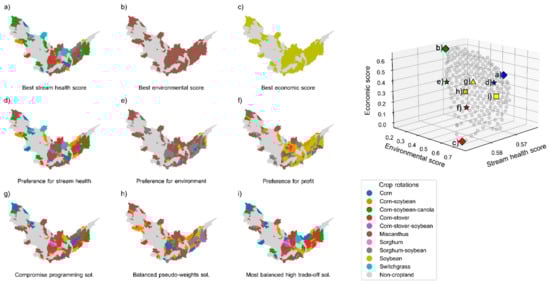 Relevant Pareto-optimal solutions: (a) best solution in terms of stream health, (b) best solution in terms of environment, (c) best solution in terms of net return, (d) trade-off solution with preference for stream health, (e) trade-off solution with preference for the environment, (f) trade-off solution with preference for net return, (g) most-preferred trade-off solution by compromise programming using the metric (Euclidian distance), (h) most-preferred trade-off solution selecting the most balanced pseudo-weight, and (i) most balanced high trade-off solution.