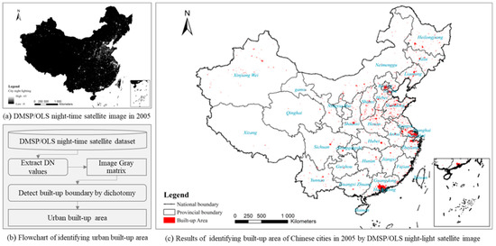 Methodological flowchart and results of urban built-up area identification using DMSP/OLS night-time-light satellite images.