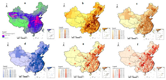 Spatial distribution of all variable values in 1999: (a) PM2.5, (b) Population, (c) Regional GDP, (d) Gross industrial production, (e) Urban electricity consumption, and (f) sulphur dioxide emission.