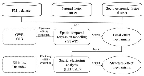 The analytical process used in this study consisted of two steps (Figure 3). First, geographically and temporally weighted regression (GTWR) was used to identify the local effect mechanisms of natural and socio-economic factors on PM2.5 concentrations [24]. Comparison models, such as GWR and ordinary least squares regression (OLS), were employed to evaluate the effectiveness of the regression results of the GTWR model. Second, a spatial clustering method, the regionalisation with dynamically constrained agglomerative clustering and partitioning algorithm (REDCAP), was used to determine the structural effect mechanisms of different associated factors on PM2.5 concentrations [25]. Different types of clustering validity evaluation indices were then applied to determine the optimal clustering results.