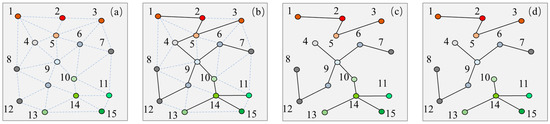 Figure 4 shows the clustering process for a simulation dataset using the REDCAP method. In Figure 4a, the shade of each point (here regarded as a city) represents the effect value of a certain factor (such as urban population) on PM2.5 concentrations. The dotted lines are the edges of the Delaunay triangulation network, which is generated based on the spatial locations of all points (cities). Each edge is linked to an attribution value to describe the similar degrees between the effect values of these two points (cites). The minimum spanning tree (the spatially contiguous tree) shown in Figure 4b can be constructed based on the connected network. Next, the tree is partitioned into several subtrees. First, the tree is partitioned by removing edge (4, 5) to create two structural regions/clusters, as shown in Figure 4c, based on the SSD measurement. Next, the best cut (9, 10) is found in the remaining edges to further create three structural regions/clusters (Figure 4d), and the above steps are repeated to generate more structural regions/clusters.