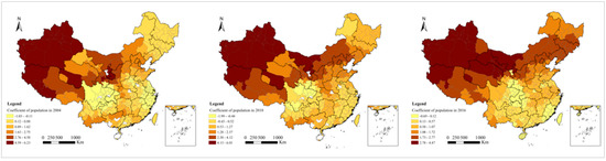 Spatial distribution of the regression coefficient for the population in 2004, 2010, and 2016.