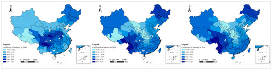 Spatial distribution of the regression coefficient for the gross industrial output in 2004, 2010, and 2016.