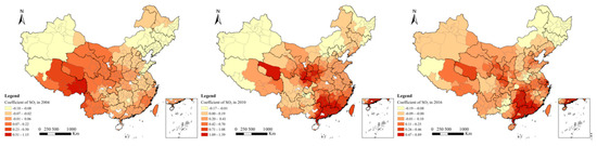 The spatial distributions of the regression coefficients for the different variables in 2004, 2010, and 2016 (Figure 5, Figure 6 and Figure 7) showed that they had an obvious spatial aggregation structure; for example, the estimated coefficient values at nearby locations tended to be closer. It is worth noting that, to clearly show the spatial distribution of the regression coefficients in Figure 5 to Figure 7, the estimated values of these regression coefficients for all cities were labelled for the whole administrative region. The minimum values of the regression coefficients of these three variables were negative (−0.76, −0.59, and −0.26; Table 3), whereas the maximum values (9.1, 2.41, and 1.32) were positive. This finding shows that all variables had both negative and positive effects on PM2.5 concentrations.