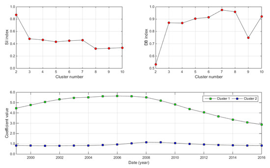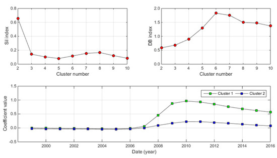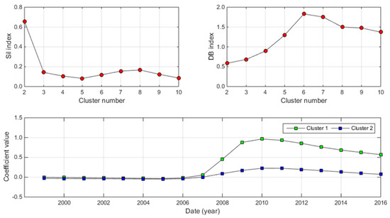 Use of the REDCAP algorithm enables the partitioning results with different numbers of clusters or regions to be obtained. Clustering evaluation is a key task to determine whether a high-quality clustering result is obtained. Existing clustering evaluation indices can be divided into two categories: external evaluation and internal evaluation [30,31,32]. The first category is statistically complex and requires prior knowledge of the clustering results, whereas the second category does not. The best clustering result is always obtained by comparing the results of different algorithms or different clustering parameters. In this research, we had no prior knowledge of the PM2.5 data. Two representative internal evaluation indices, Silhouette (Sil) and Davies–Bouldin (DB) indices, were selected to identify the validity of the partitioning result [33,34]. A better clustering result generally corresponds to a larger Sil value or a smaller DB value. The change curves of the Sil and DB indices thus enable the optimal partition result to be obtained.