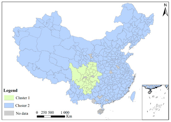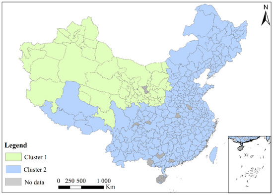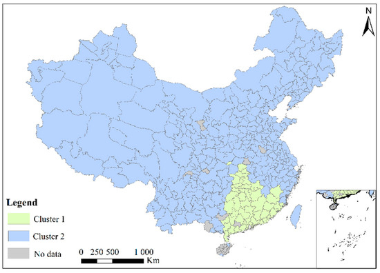 The regression coefficients exhibited obvious spatial aggregation. Therefore, the REDCAP algorithm was used to quantitatively identify the aggregation structure for each one. Based on the similarity of regression coefficients of the population, all cities were divided into 2 to 10 clusters. The Sil and DB indices were then applied to determine the optimal clustering results. Although neither polyline (Figure 8a,b) had extrema values (a maximum Sil value and a minimum DB value) in the intervals, it is reasonable that the boundary point, corresponding to a relatively large Sil value and a relatively small DB value [35], was identified as the optimal parameters of the clustering structures. The cluster number should be two when the Sil value is relatively large and the DB value is relatively small. The spatial distribution of the obtained two clusters is shown in Figure 9, and the corresponding statistical result is shown in Figure 8c.